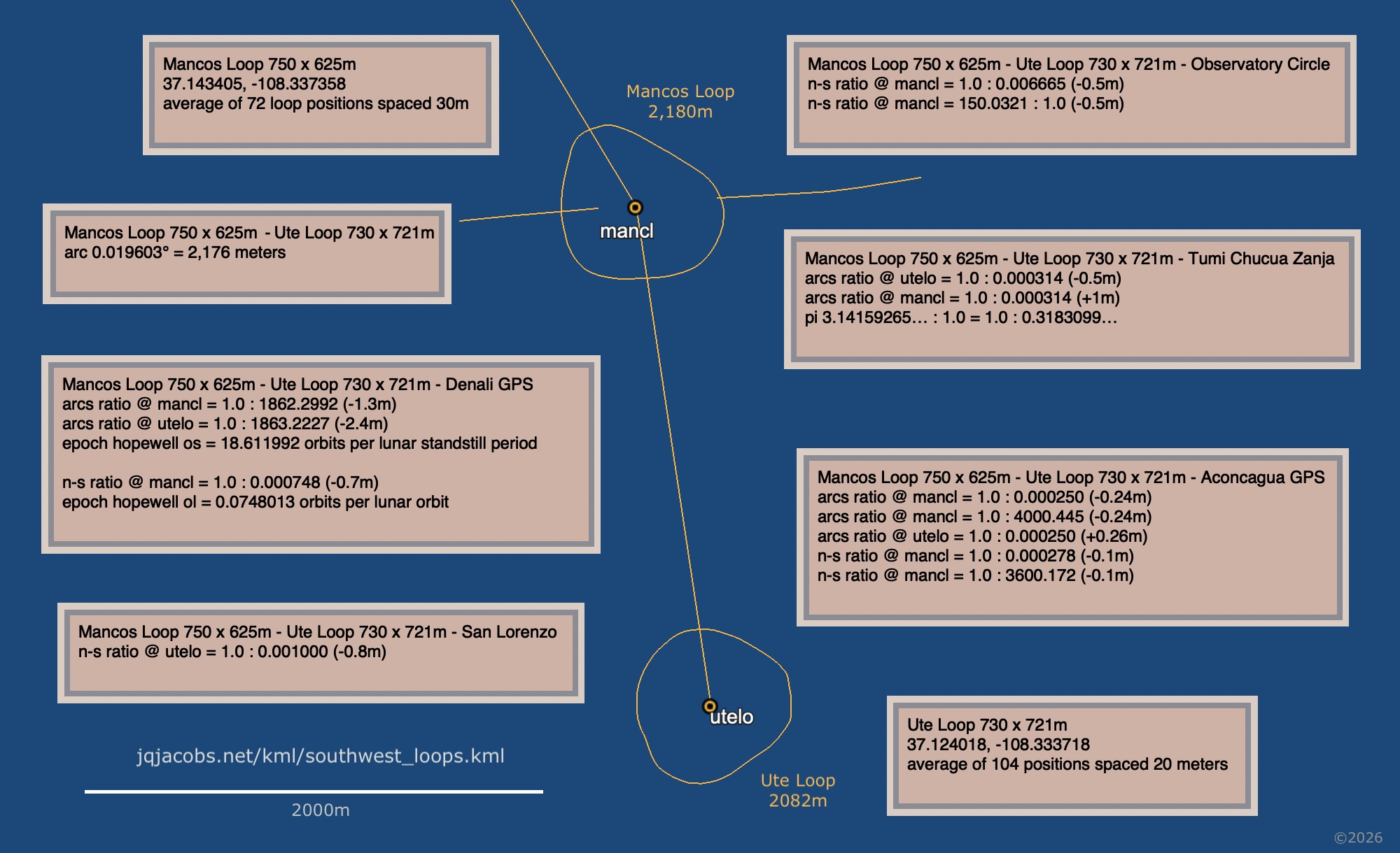 The methodology of averaging evenly spaced positions along large loops applied to loops near each other, three on Cedar Mesa and two on the Mesa Verde plateau, provides sufficient confidence in datums to examine their interrelationships. The Grand Gulch Loop 1225 x 1124m - Cedar Mesa Loop 1024 x 880m - Picket Flat Loop 975 x 888m centerpoints are spaced with an arcs ratio of 1.0 : 0.999702 (10,795m : 10,792m) at Cedar Mesa Loop. Once again, the result margin of error is less than the assumed margin of error of their coordinate determinations. Given the methodology, greater precision for this result cannot be expected. The Mancos Loop to Ute Loop arc distance (2,176 meters) matches the Mancos Loop perimeter (2,180 meters) within the expected margin of error. Applying the refined datum determination method to two such proximate loops provided sufficient confidence to examine their placement in relation to other monuments and mountains. Their center-on-center spacing is one twentieth the arc distance from Ute Loop to Aztec Hubbard Tri-Wall Kiva. The following graphic presents more Mancos Loop and Ute Loop results.