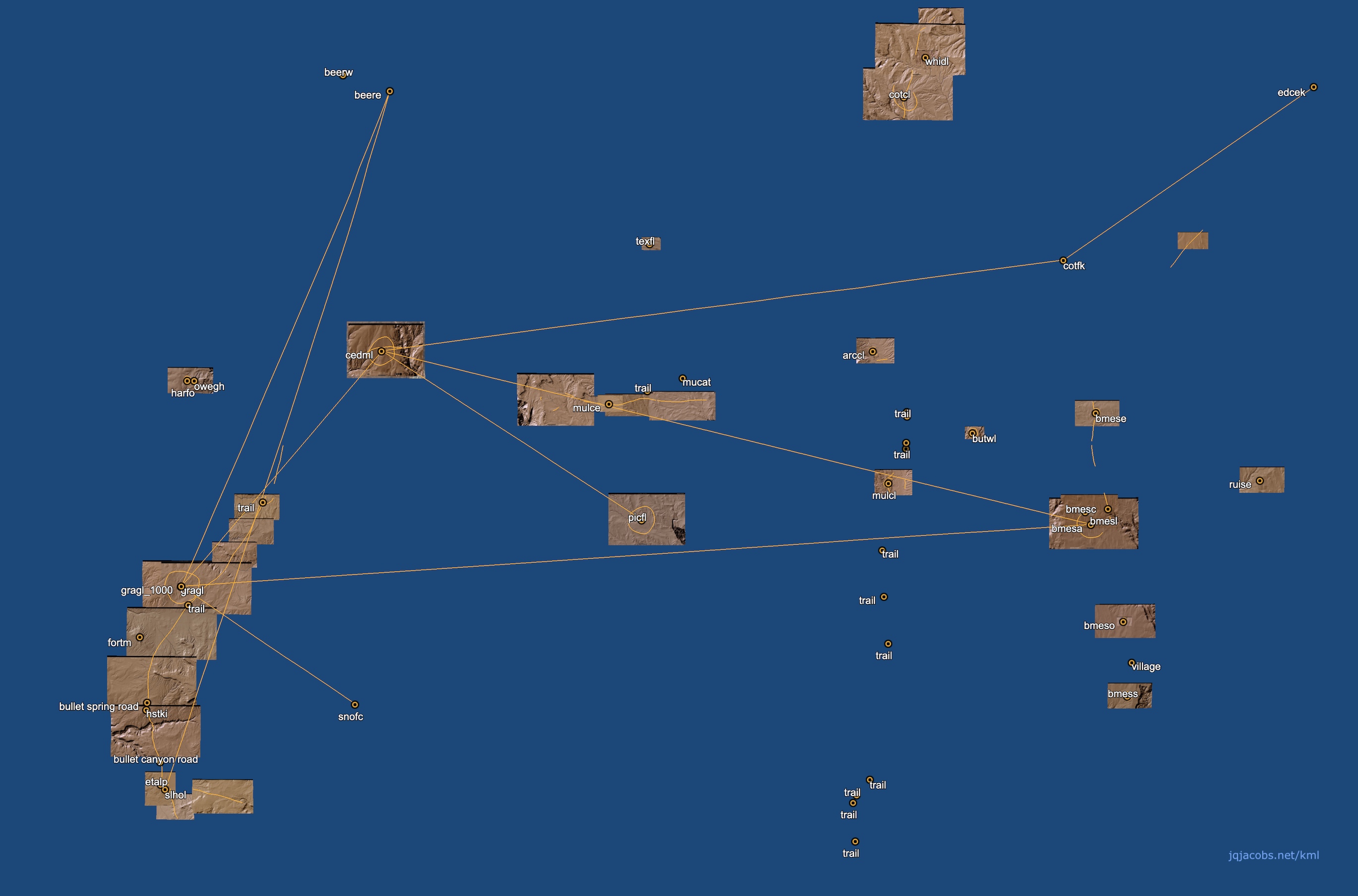 Study continues. The KML file includes more discussions. The following graphic displays the results with tessellated lines representing the selected site relationships in the KML file.