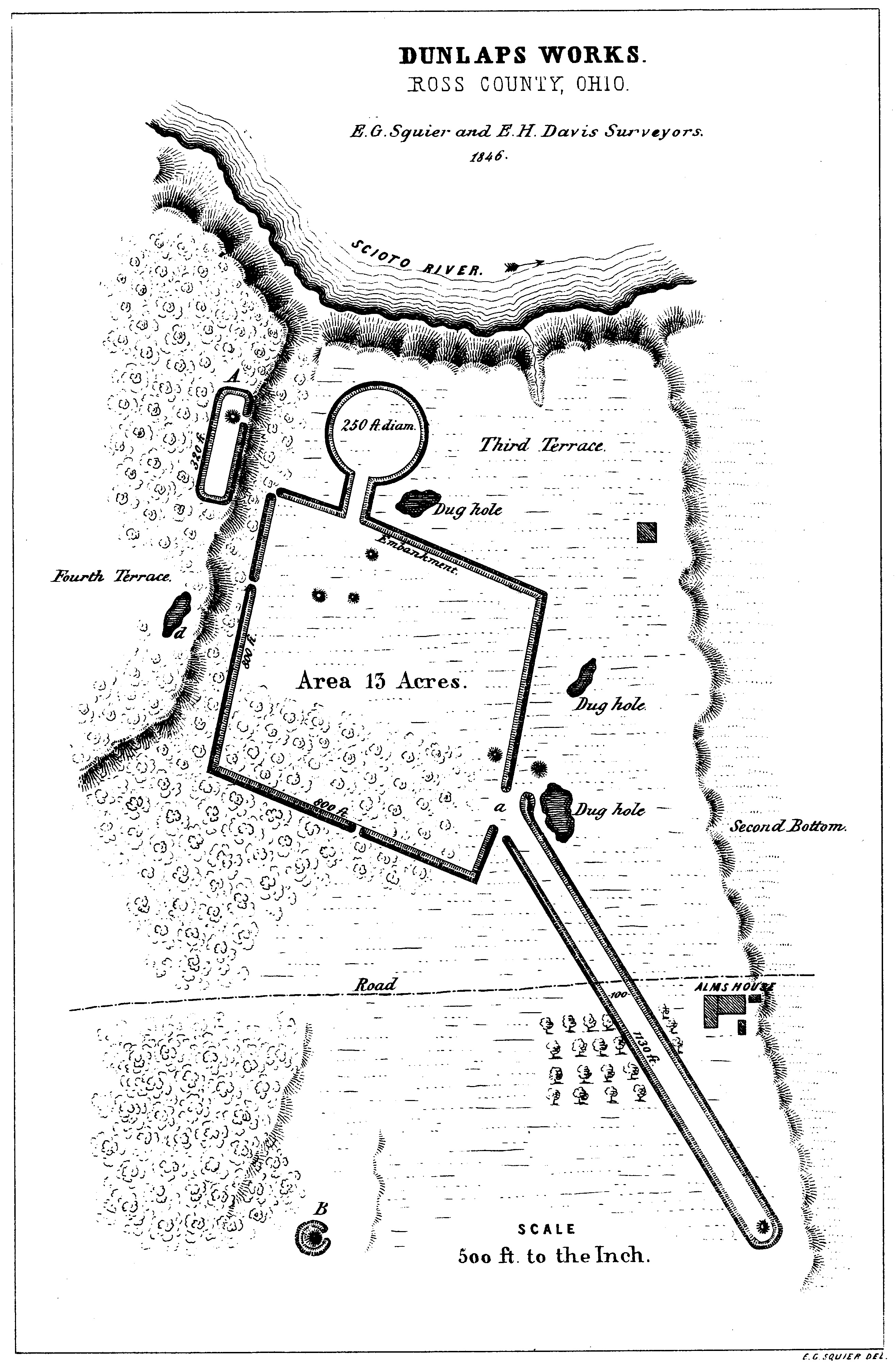 | Possible Geodetic Properties and Relationships of Some Monumental Earthworks in the Middle Ohio Valley. A Preliminary Inquiry ©2003 by James Q. Jacobs Squier and Davis Drawings Dunlaps Works, Ross County 2632 x 4024 pixels |