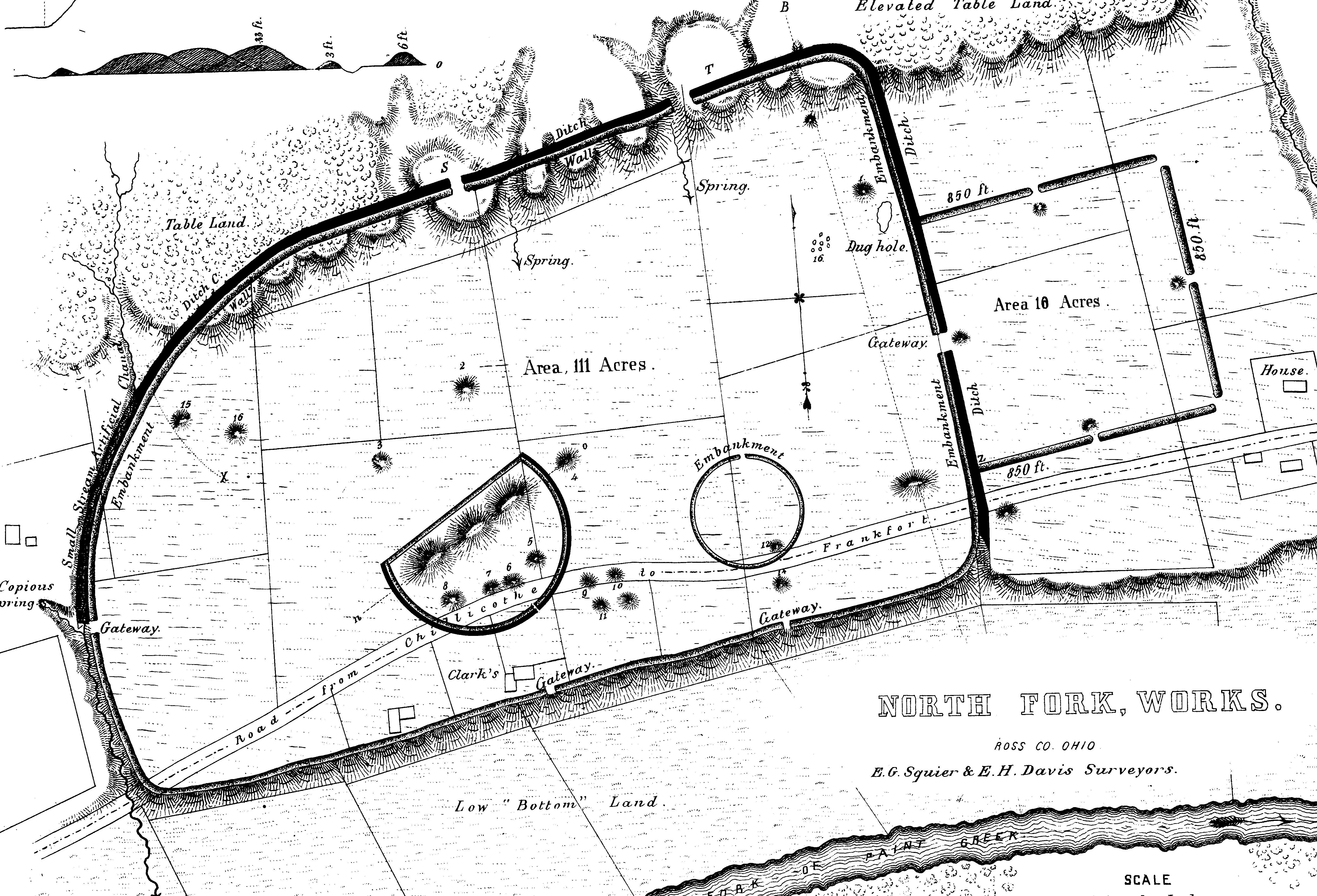 | Possible Geodetic Properties and Relationships of Some Monumental Earthworks in the Middle Ohio Valley. A Preliminary Inquiry ©2003 by James Q. Jacobs Squier and Davis Drawings North Fork Works, Hopewell, Ross County 5261 x 3579 pixels |