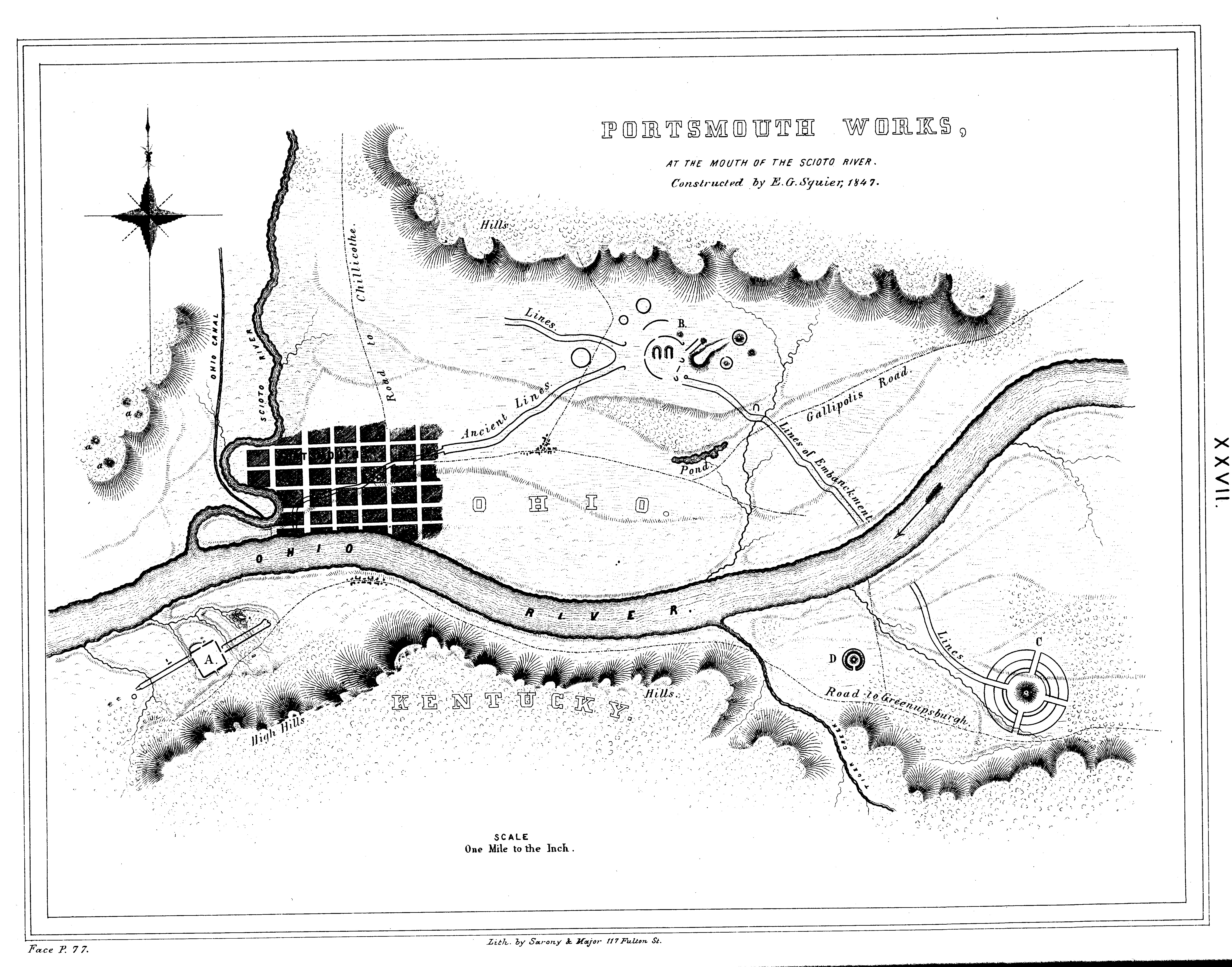 | Possible Geodetic Properties and Relationships of Some Monumental Earthworks in the Middle Ohio Valley. A Preliminary Inquiry ©2003 by James Q. Jacobs Squier and Davis Drawings Portsmouth Works, Ohio River 5726 x 4496 pixels |