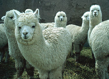 Alpacas at a regional fair in Juliaca, Puno, Perú. Quality of fleece is an important consideration when judging these competitors. |