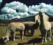 Rich sunset colors drench a typical altiplano family compound, or wasi. This home is located above 14,000 feet in Azangaro province, Department of Puno, Perú. The temperature drops dramatically at sunset. At this altitude the growing season is too short for potatoes. The area is well suited to alpacas, llamas and vicuñas. |