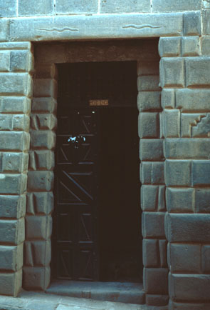 An ancient Incan masonry doorway on a Cuzco street. Original Incan masonry lines many Cuzco streets and can be seen in restaurants, homes and churches. In a recent earthquake plaster broke from some walls to reveal previously hidden Inca walls of the Coricancha inside the monastary of St. Augustine's church. |