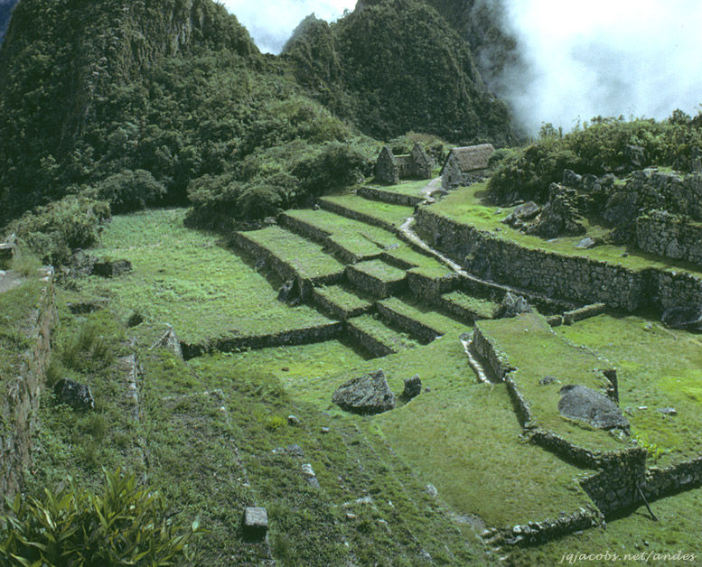 View from the House of Three Windows area across the plaza. The foreground terracing separates the upper and lower plazas. The Urubamba River passes far below, to the right of the peak in the background, flowing towards the ruins and then around the base of Huaynu Picchu's sheer, vertical slopes. |